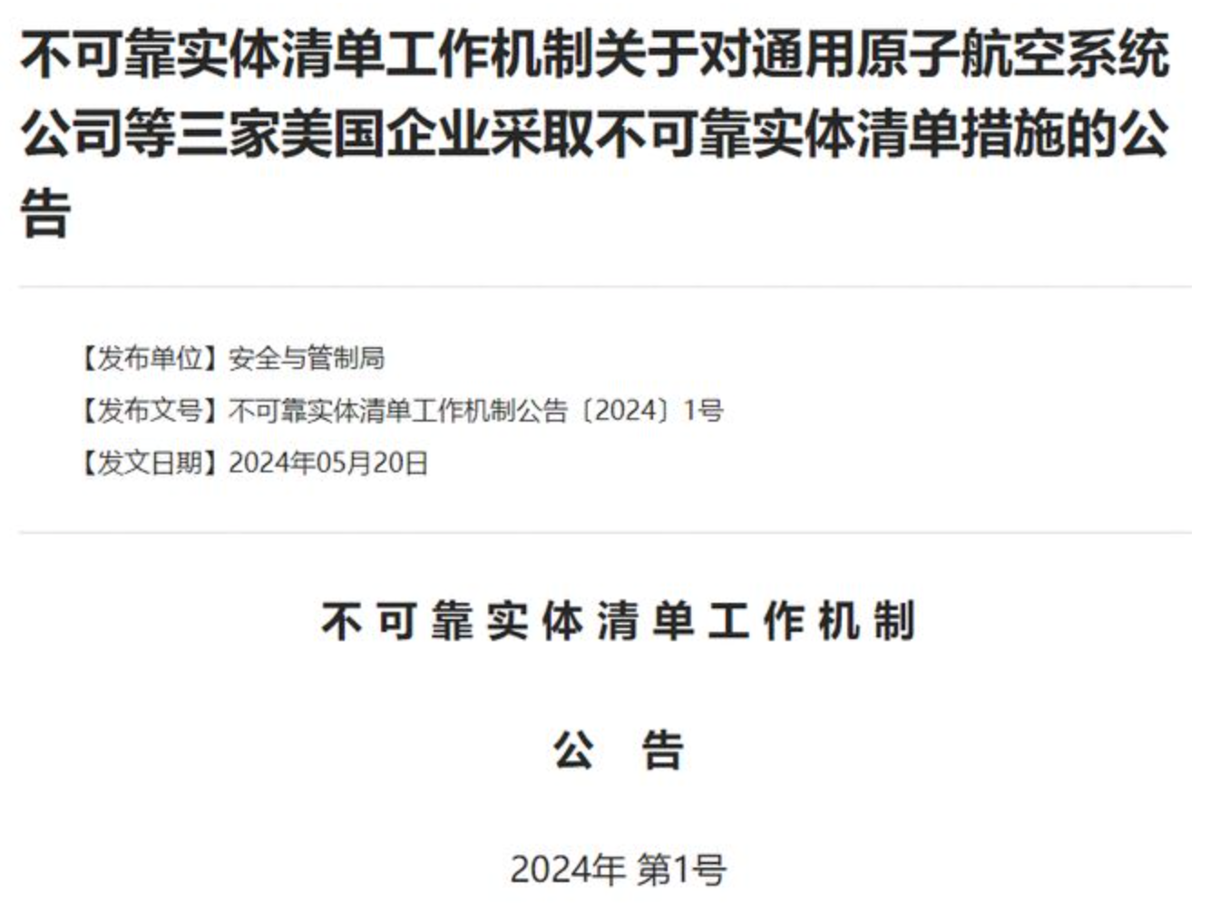 网易财经5月20日讯 商务部发布公告,决定将参与对台湾地区军售的美国通用原子航空系统公司(General Atomics Aeronautical Systems)、美国通用动力陆地系统公司(General Dynamics Land Systems)列入不可靠实体清单,并采取以下处理措施:禁止上述企业从事与中国有关的进出口活动;禁止上述企业在中国境内新增投资;禁止上述企业高级管理人员入境;不批准并取消上述企业高级管理人员在中国境内工作许可、停留或者居留资格。