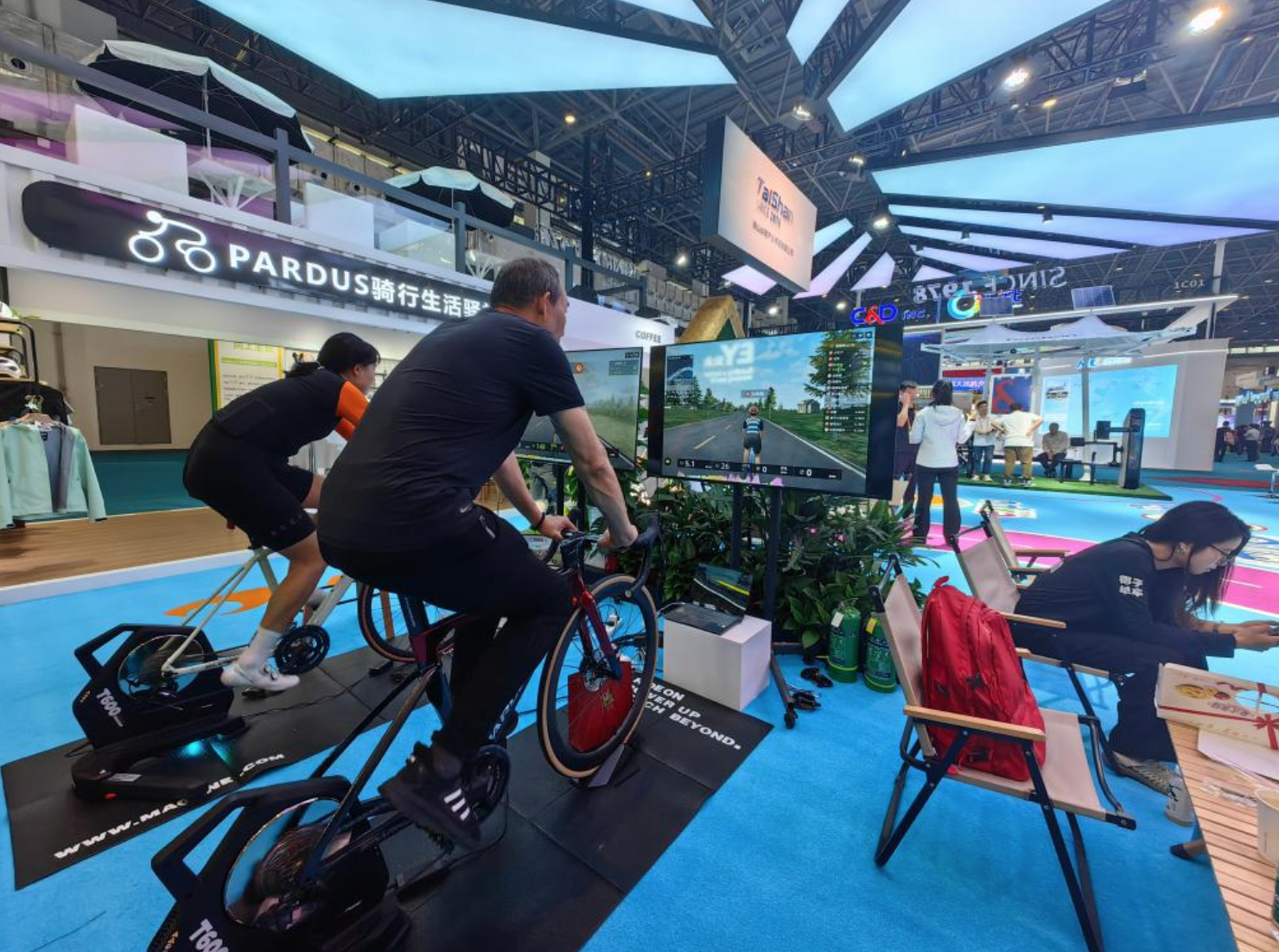 ▲观众在第四届消博会上体验可模拟各种山地场景骑行的自行车。新华社记者(吴茂辉 摄)