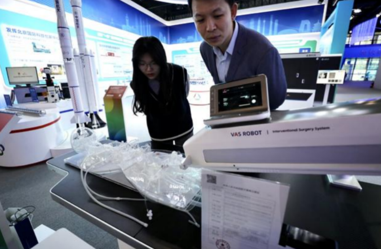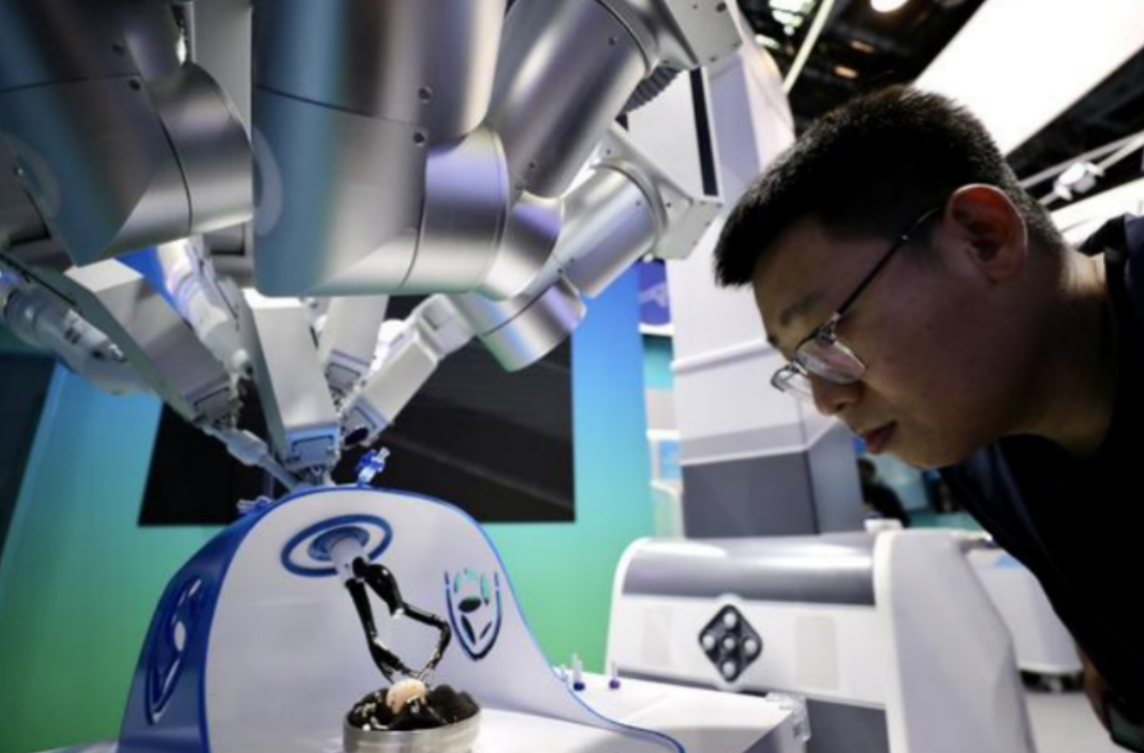 4月27日,媒体记者了解微创血管介入手术机器人。中国日报记者(张威 摄)