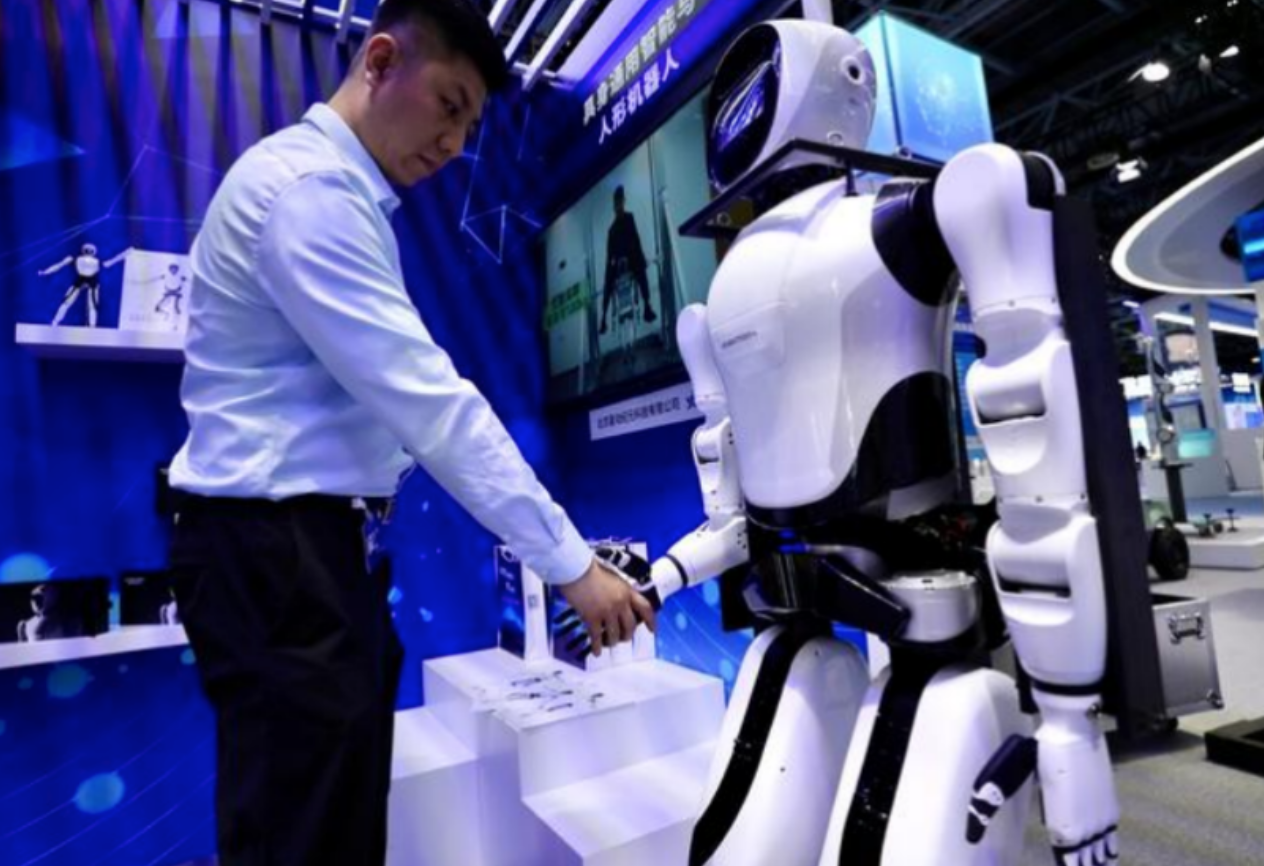 4月27日,媒体记者和具身通用智能与人形机器人互动。中国日报记者 (张威 摄)