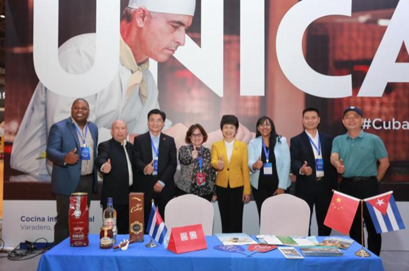 ▲古巴共和国驻广州总领事馆总领事丹尼思女士 DenisseLlamos Infante ( 右三 ) , 海南省贸促会副会长林春红 ( 右四 ) , 原海南省食品药品监督管理局巡视员、海南省餐饮服务管理协会会长许亚川 ( 左三 ) , 海南省旅游餐饮协会常务副会长兼秘书长唐洁春 ( 左二 ) 等领导与企业嘉宾合影留念