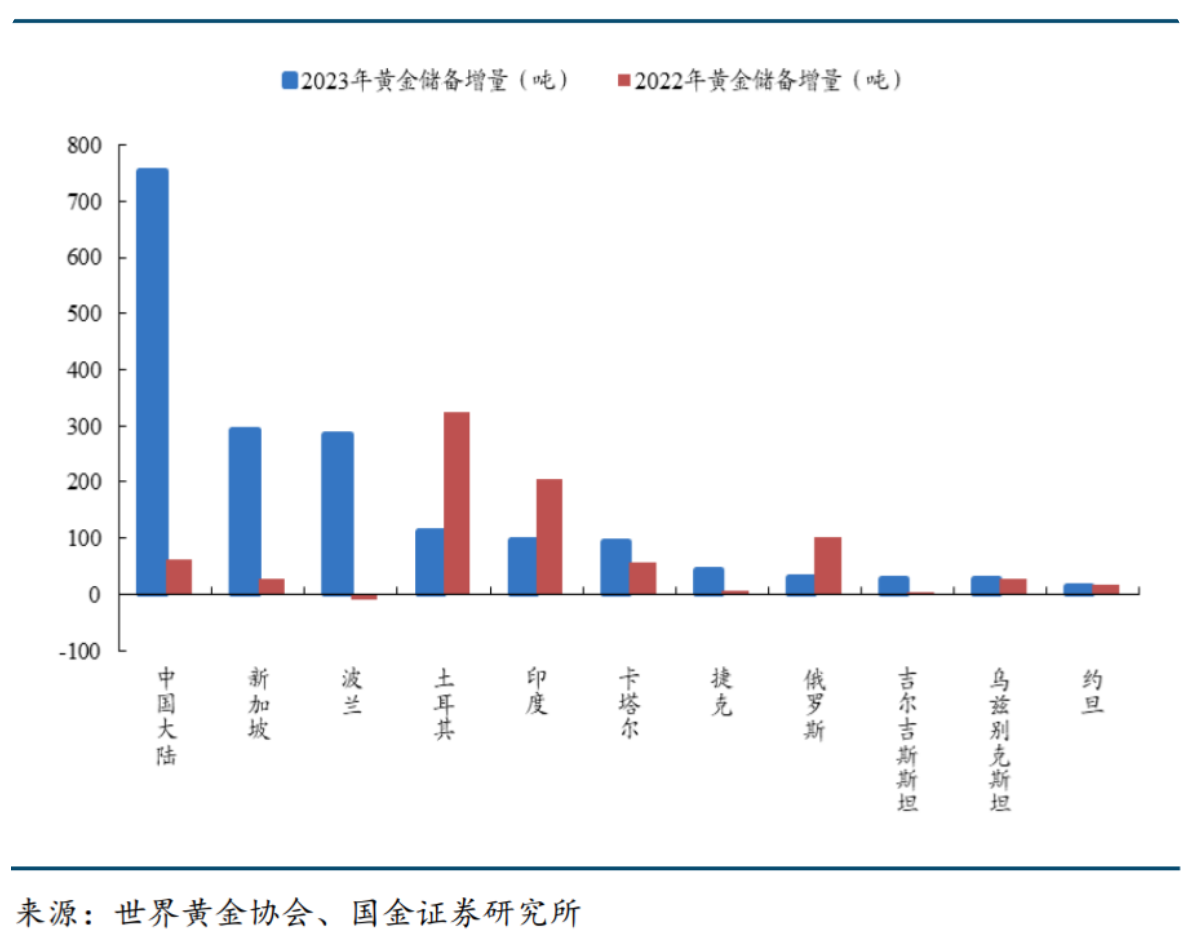 据世界黄金协会的最新数据,2022至2023年间,黄金储备的增持量在新兴市场国家中尤为显著。中国领先,增持了惊人的815.5吨黄金,其次是土耳其的436.7吨、新加坡的319.4吨、印度的299.5吨,以及波兰的275.1吨。此外,卡塔尔和俄罗斯也分别增持了152.7吨和133.7吨。