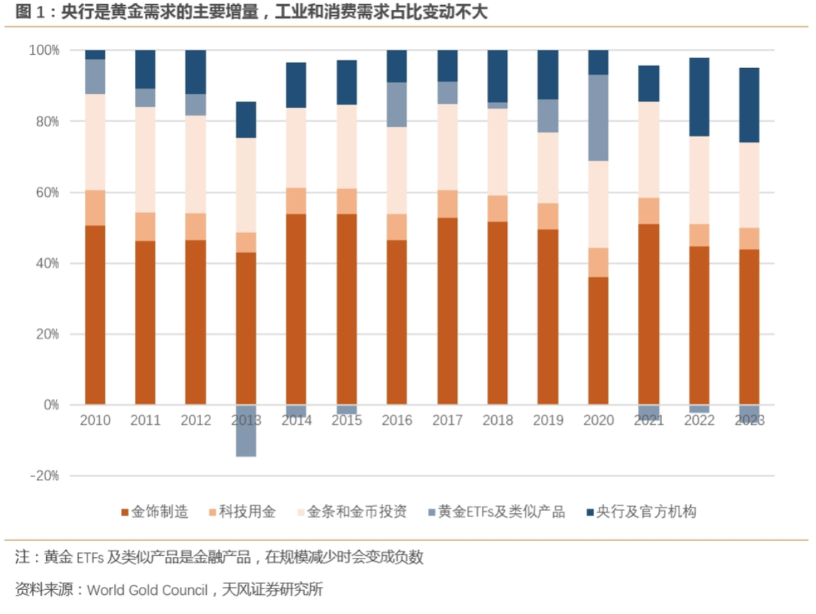 而工业和消费需求相对稳定,投资需求虽强劲但占比较低,因此央行储备成为黄金需求的主要增量。