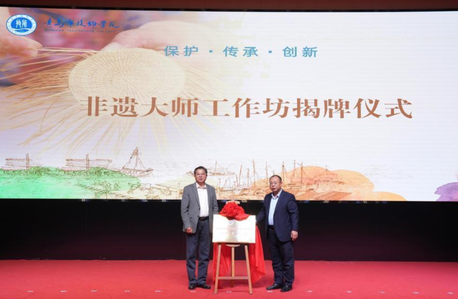 青岛市技师学院党委副书记柴清林和平度市新河镇党委书记王建平共同为“指间大象”新河草编非遗大师工作坊揭牌。
