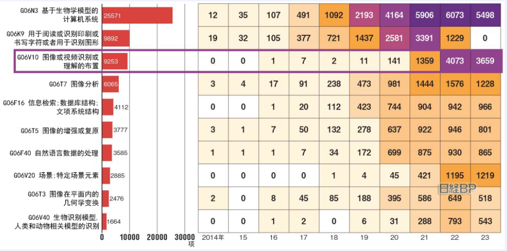 从2022年前后开始,“图像或视频识别或理解的布置”的数量迅速增加(出处:日经XTECH、Patentfield)