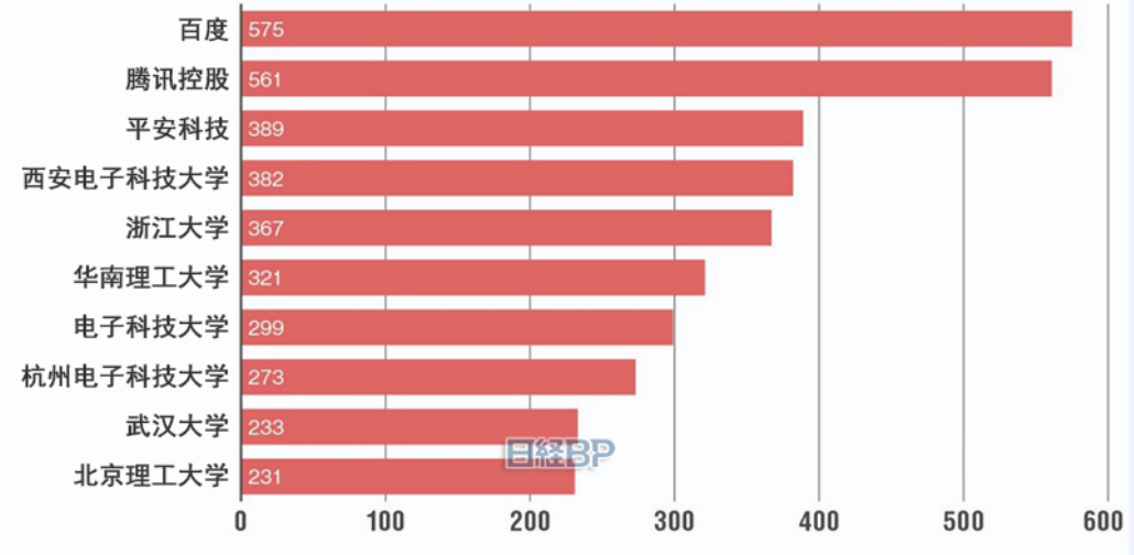 韩国的发展也很明显,在专利整体数量方面,仅次于中国、美国和日本,排在第4位,而在生成式AI领域为4123项,远远超过日本的1408项。 分析中国的专利,可以看出该国的生成式AI的情况。按企业和组织来看,第一名是百度的575项,第二名是腾讯控股的561项。与这两家企业共同构成“BATH”的华为技术和阿里巴巴集团也申请了100项以上。申请数前10名均为中国国内的企业与大学。