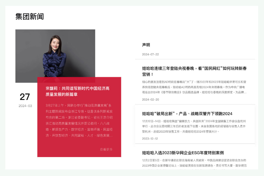 ▲ 娃哈哈集团的新闻中心网页仍然以宗馥莉为视觉焦点。(截图自娃哈哈官网)