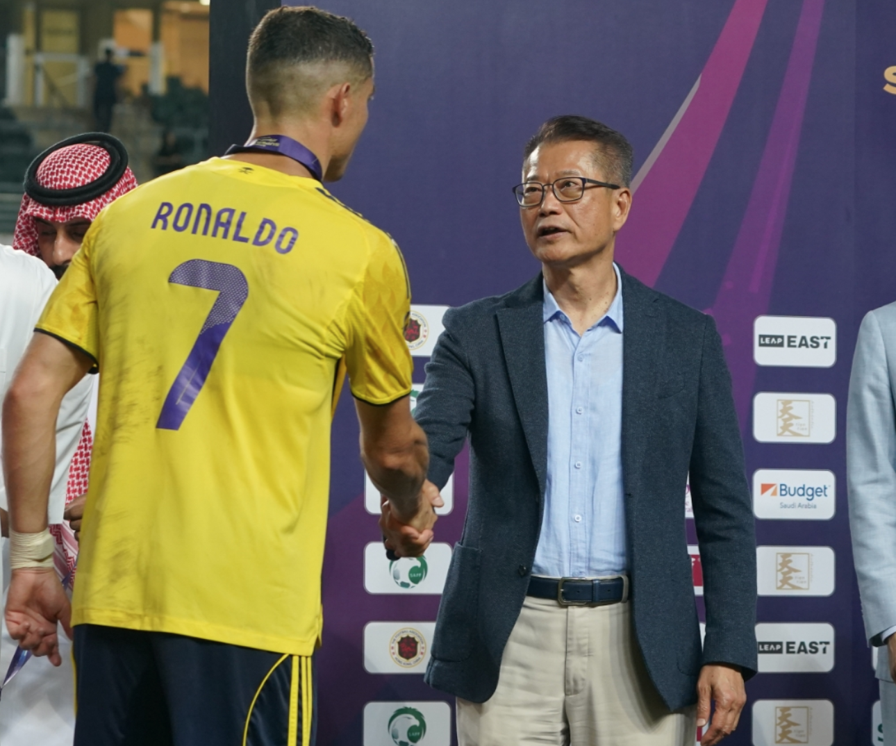 顶图:陈茂波昨晚(23日)在香港大球场观赏沙特超级盃决赛,并主持颁奖礼。(陈茂波网誌)