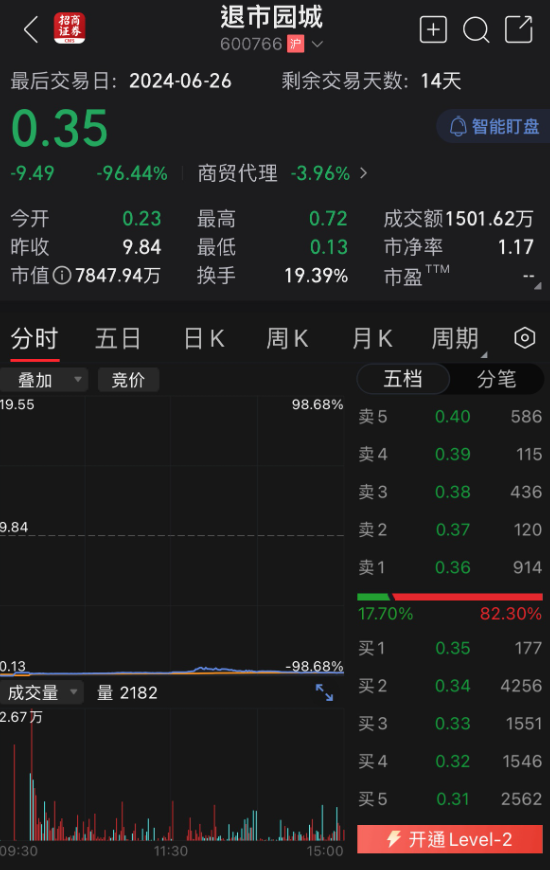 行情数据显示,今日正式进入退市整理期的退市园城(600766)、退市同达(600647)、退市碳元(603133)盘中狂泻,其中退市园城上午开盘报0.23元,跌幅高达97.66%,盘中跌幅甚至一度达98.68%。另外两只股票也惨不忍睹,退市碳元今天开盘跌50%,盘中进一步下挫,一度跌87.37%;退市同达上午开盘跌49.93%,盘中最大跌幅一度达到85.55%。截至收盘,这三只股票均跌超80%,其中退市园城收盘重挫96.44%,创出A股单日最大跌幅纪录。