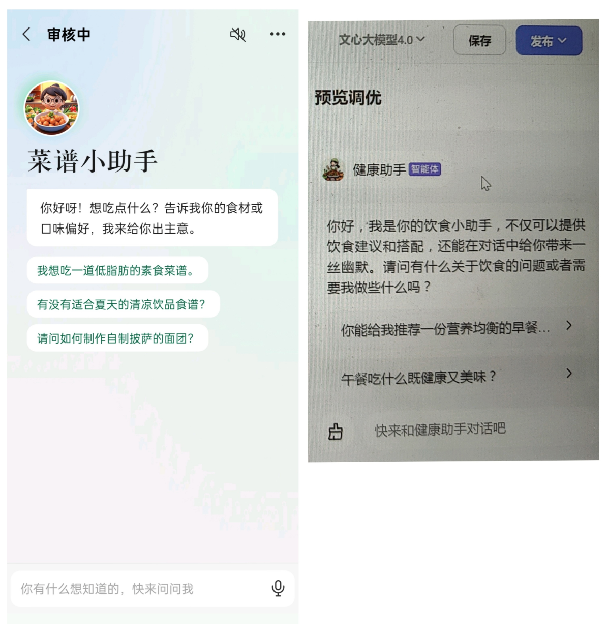 ▲元宝App和文心智能体平台生成的个人智能体,前者在审核中,后者为预览版
