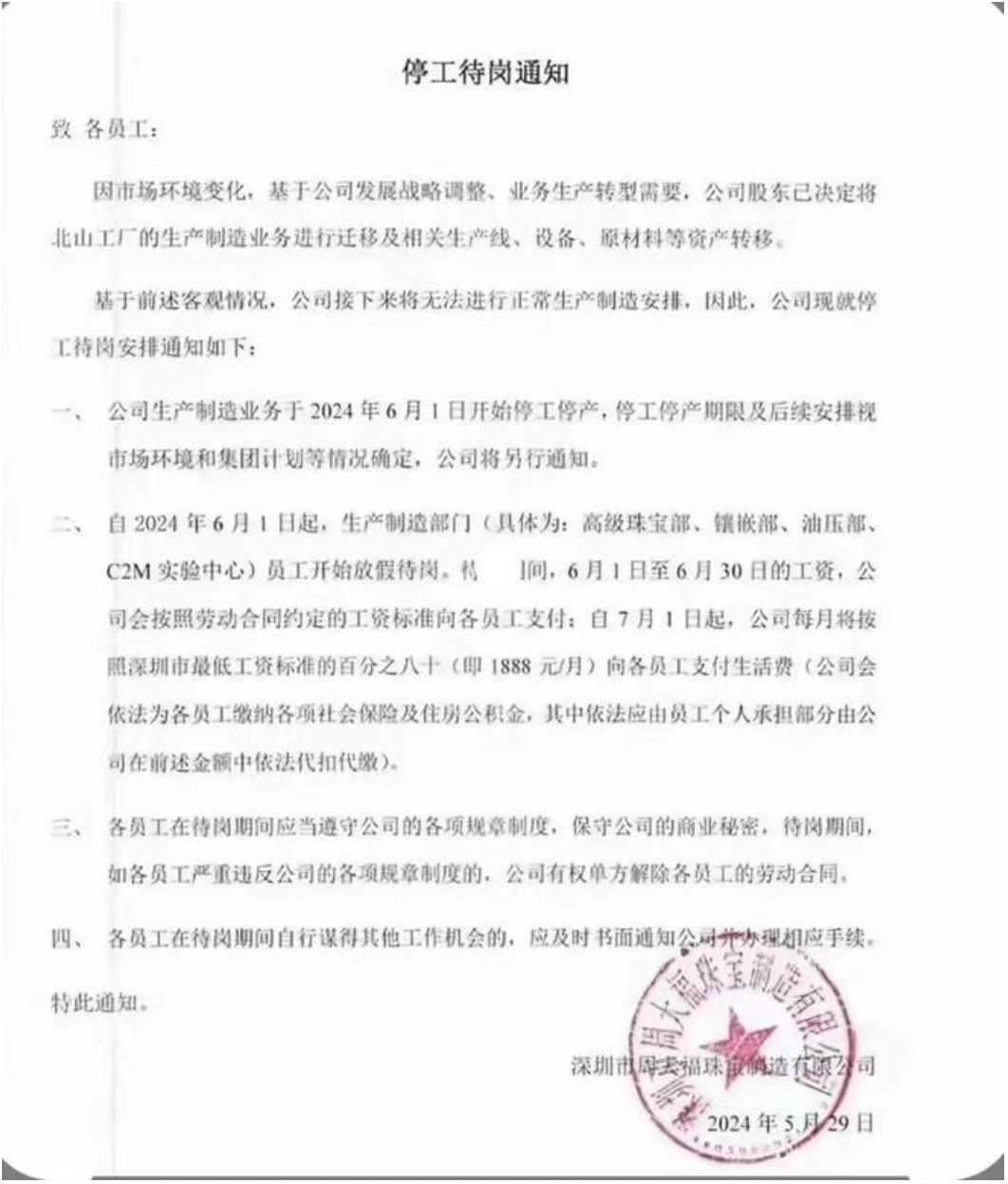按照上述通知,周大福深圳南山工厂生产制造业务于2024年6月1日开始停工停产。“停工停产期限及后续安排视市场环境和集团计划等情况确定,公司将另行通知”。