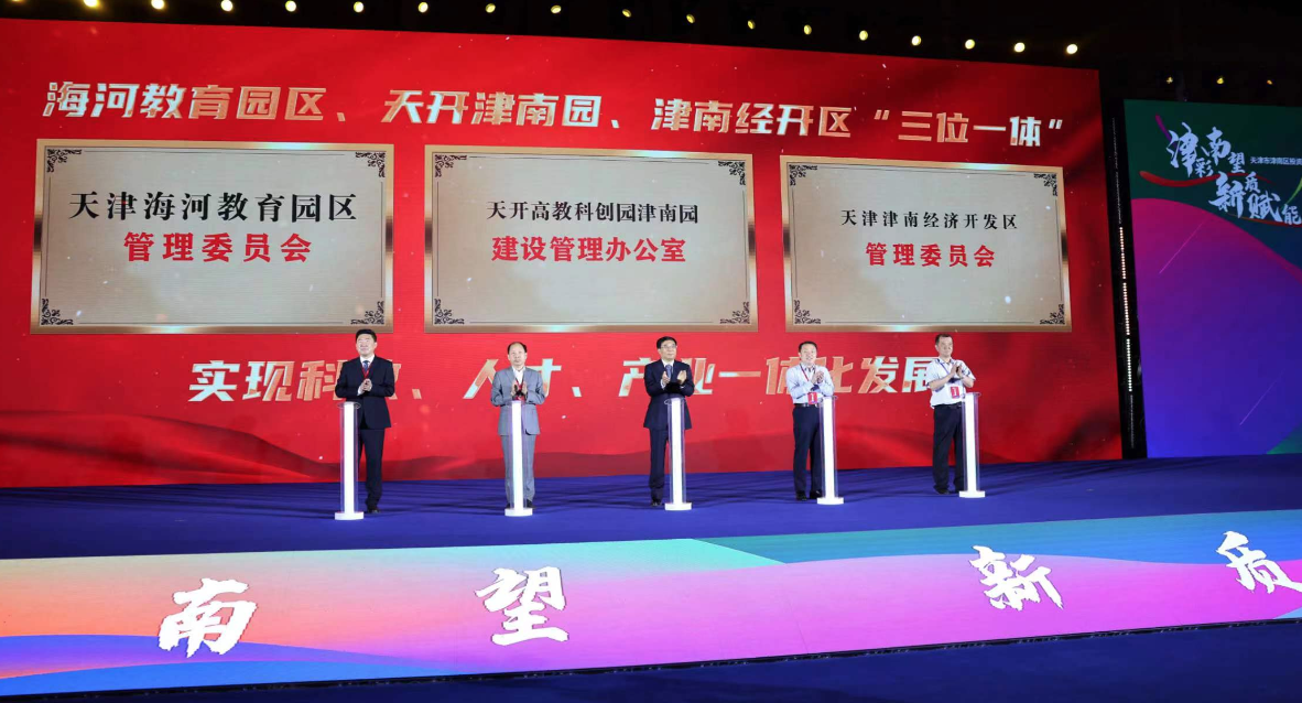 活动举行了海河教育园区、天开津南园、津南经开区“三位一体”改革管理机构揭牌仪式。津南区委副书记、区长杨灏向与会嘉宾介绍了天开津南园发展情况,从资源整合、载体配套、政策导入、培育孵化、体制机制创新等多方面,全方位展示天开津南园开园一年来的各项推进成果。
