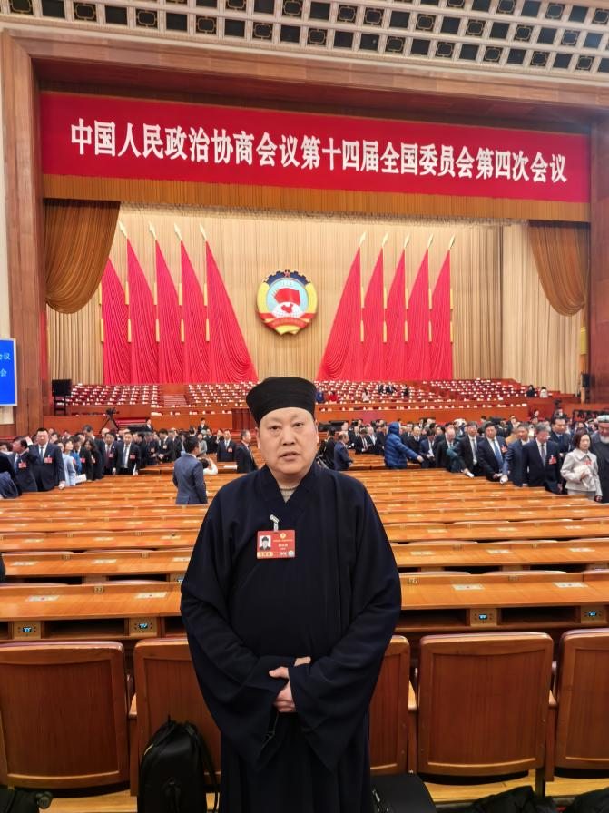 全国政协十四届四次会议期间,身着道袍的唐诚青委员神情庄重,在人民大会堂内留影。他胸前佩戴的红色出席证,不仅是身份的象征,更承载着道门弟子与宗教界人士对国家发展的深切期盼。作为来自四川青城山的宗教界代表,唐诚青长期关注道教文化遗产保护与场所安全问题。
